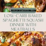 Baked Spaghetti Squash with Meatballs is a healthier take on the classic spaghetti and meatballs, featuring roasted spaghetti squash strands topped with marinara, juicy meatballs, and melted mozzarella. Naturally gluten-free, low-carb, and family-friendly, this easy dinner is both wholesome and comforting.