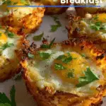Crispy hash brown nests filled with baked eggs and melted cheese, perfect for a breakfast or brunch dish that combines comfort and convenience in one bite-sized serving.