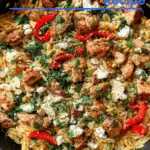 This Lemon-Feta Chicken and Orzo recipe is a vibrant, Mediterranean-inspired one-pan dish perfect for a wholesome weeknight dinner. Tender chicken pieces are seasoned with oregano, smoked paprika, and garlic, then sautéed to golden perfection. Combined with sautéed onions and red bell peppers, toasted orzo pasta, and fresh baby spinach simmered in flavorful chicken broth, it’s topped with a tangy marinated feta, fresh dill, parsley, and a burst of bright lemon zest and juice. The result is a delicious, comforting meal that balances savory, fresh, and zesty flavors all in one skillet.