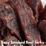 This smoked beef jerky recipe offers a flavorful, tender jerky with a perfect balance of savory, sweet, and spicy notes. Made with thinly sliced round steak marinated overnight in a blend of soy sauce, Worcestershire sauce, garlic powder, sugar, and crushed red peppers, then slowly smoked to achieve a deliciously smoky taste and chewy texture. Ideal for a protein-packed snack or camping treat.