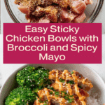 This Asian-inspired Sticky Chicken Bowls recipe combines tender chicken strips coated in a flavorful sticky sauce with steamed broccoli and fluffy rice. Finished with a spicy mayo drizzle and sesame seeds topping, this dish delivers a perfect balance of sweet, savory, and spicy flavors in a simple one-skillet meal.