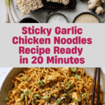 Sticky Garlic Chicken Noodles is a flavorful and easy-to-make Asian-inspired main course featuring tender chicken coated in a sweet and savory garlic honey sauce, tossed with perfectly cooked noodles. This quick stir-fry recipe combines juicy chicken pieces with a rich sauce made of soy, honey, garlic, and ginger, enhanced with a hint of chili flakes for subtle heat. Garnished with fresh green onions and sesame seeds, it’s perfect for a weeknight dinner that satisfies both taste and hunger.
